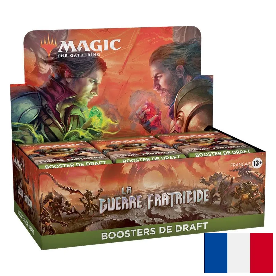 La boîte de boosters de draft La Guerre Fratricide contient 36 boosters de draft La Guerre Fratricide. Chaque booster de draft contient 15 cartes et 1 carte publicitaire ou de jeton, dont 1 carte de rareté rare ou supérieure, 1 carte de rareté inhabituelle ou supérieure, 3 cartes inhabituelles et 10 cartes courantes. Une carte de planeswalker rare mythique sans bordure Premium traditionnelle dans <1 % des boosters. Un terrain de base mécanique pleine illustration remplace une carte courante dans 25 % des boosters. Une carte Premium traditionnelle de n’importe quelle rareté remplace une carte courante dans 33 % des boosters.